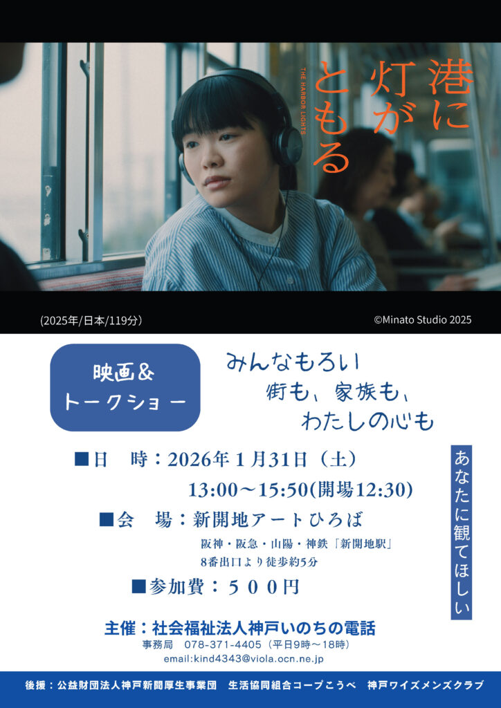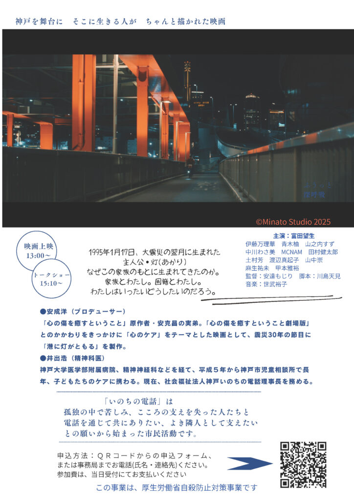 神戸いのちの電話主催の映画&トークショー、上映作品は「心のケア」をテーマに、”いま”の神戸を舞台にした港に灯がともる。プロデューサーに名を連ねる安成洋氏は、30年前の震災のあと、神戸の人々の心に寄り添った精神科医で、映画『心の傷を癒すということ』の原作者・安克昌氏の実弟です。上映会では、安成洋氏と、精神科医で神戸いのちの電話理事長・井出浩とのトークショーも行います。映画と貴重なトークを、一緒に楽しみませんか。